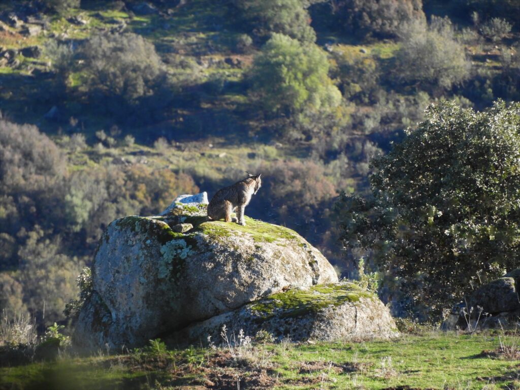 La pista parece llegar a un alto y ante nosotros se abre un inmenso valle, donde suaves relieves y multitud de rocas a escudriñar. Tenemos tarea, así que dejamos el coche en un apartadero y montamos los telescopios. La paciencia es la primera clave para la observación de linces en libertad. La segunda probablemente sea la suerte, aunque es muy importante saber identificar los indicios, pues la fauna avisa al paso del gran depredador de estos montes. La búsqueda nos muestra de nuevo otras especies. Gamos y ciervos vuelven a aparecer en cantidad, mientras dos conejos juegan en un llano y una perdiz se desgañita encima de una roca. Un cacarea inconfundible desplaza nuestra vista hacia los cielos. Es un águila imperial ibérica, otra especie endémica de la península. Sus hombros blancos destellan cuando los rayos de sol inciden en ellos, y su observación es uno de los regalos del día.