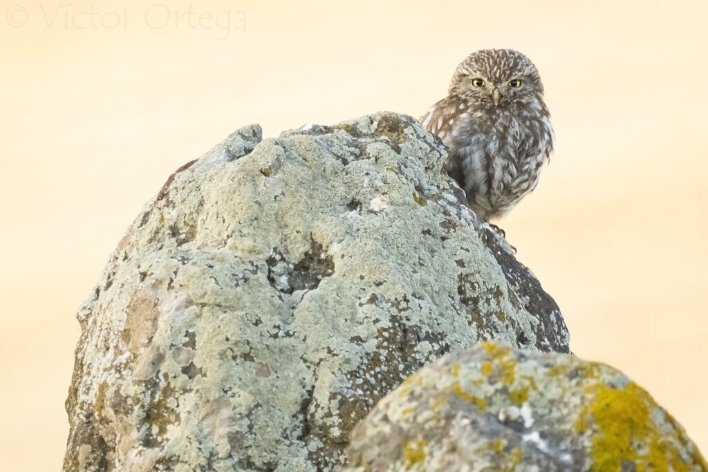 Con este primer objetivo conseguido, volvemos al vehículo para dirigirnos a otro punto de observación, donde nos vamos a centrar en el lince ibérico. Aquí el paisaje cambia rápidamente, y tras abandonar el bosque de galería ligado al curso fluvial, transitamos por unas repoblaciones de pino piñonero antes de llegar a las zonas de encinas y alcornoques, muchas adehesadas, donde estas quercineas se combinan con madroños, lentiscos o acebuches en un terreno salpicado de rocas de granito cubiertas de musgo, denominadas bolos por la suave erosión que les ha concedido una forma curva. Por estas dehesas la clave es conducir despacio, observando cada palmo de terreno, pues nunca se sabe donde puede estar descansando un lince. Este método, si bien no nos muestra el ansiado félido, nos permite ver multitud de otras especies que lo acompañan en su territorio, entre las que destaca un mochuelo que podemos disfrutar encima de una bolo. Son las rapaces nocturnas con mayor actividad diurna, y no es raro observar varios ejemplares en nuestras rutas. Antes de llegar al punto elegido para la segunda espera, un grupo grande de gamos nos sorprende y nos obliga a bajar del coche para disfrutarlos con calma.