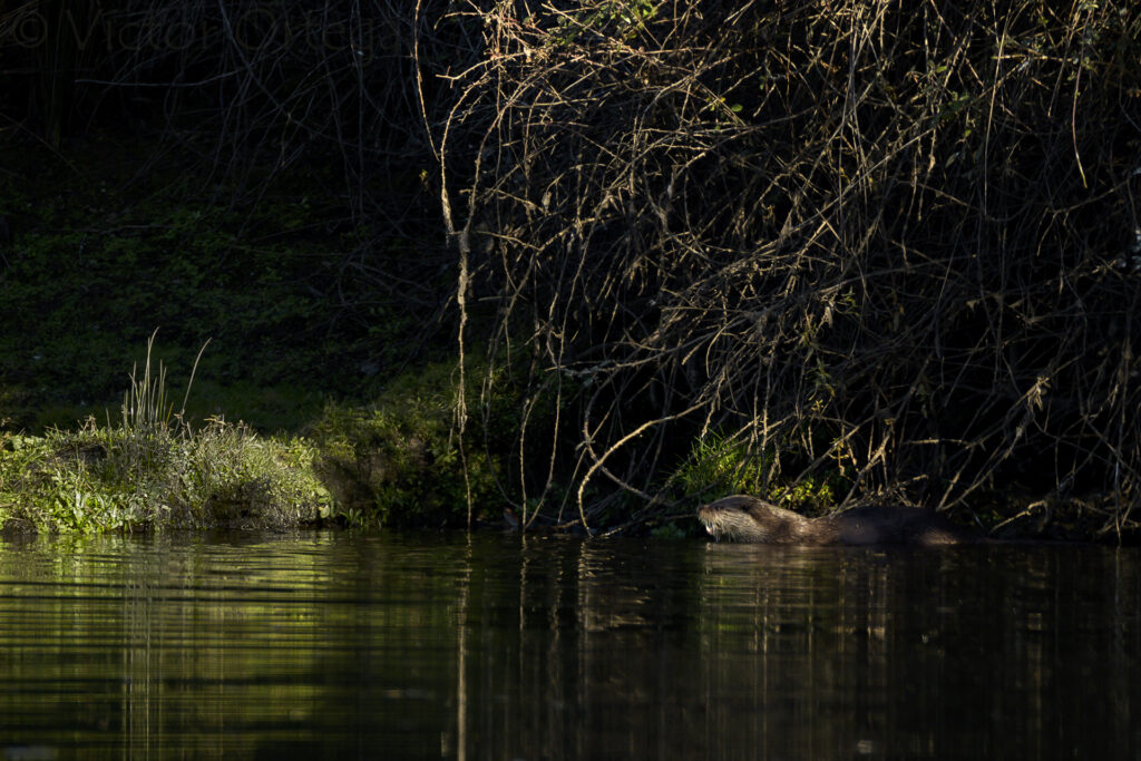 Observamos varias especies de aves, como el avión común, el rabilargo o el pico picapinos. La mañana se va templando, la niebla se disipa con los primeros rayos de sol y la nutria no se hace esperar, haciendo una aparición rápida pero permitiéndonos tomar algunas fotos. Son animales inquietos que parecen jugar a la vez que recorren sus dominios acuáticos.